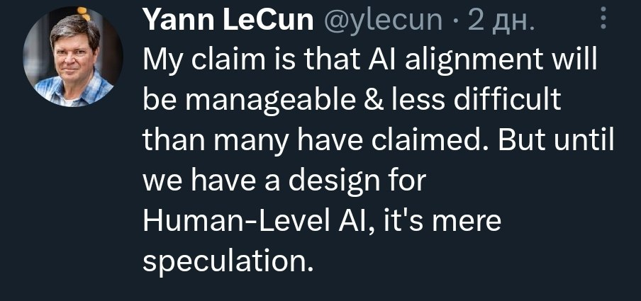 Лекун каждый день строчит по 5-10 твитов, порицающих сумасшедших AI-думистов, и постоянно потешается над теми, кто думает, что LLM - это что-то близкое к AGI. В Фейсбуке же иногда случаются и более глубокие дискуссии. Стюарт Расселл и другие возражают Лекуну и говорят, что стремление AI к контролю над миром может появиться и непреднамеренно, как следствие другой задачи или цели. Лекун же считает, что есть множество способов защитить себя от этих проблем при создании AI - например, изменить целевую функцию или добавить дополнительные механизмы защиты (“safeguards”). Причём, для AI такие механизмы создавать намного легче, чем для людей. Поведение людей можно менять только опосредованно - через образование и законы, а в AI можно напрямую вложить ценности и правила при обучении - не убий, не укради, не возжелай AI ближнего своего.