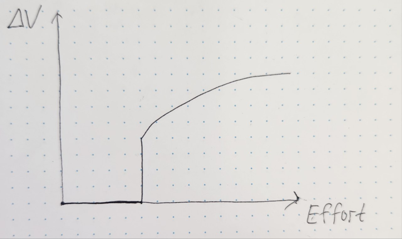 Ещё одна проблема - выделение бюджета времени на работу с техдолгом. Посмотрим на упрощённый график зависимости прироста скорости проверки гипотез от приложенных усилий на примере задачи рефакторинга проекта или изменения архитектуры системы.