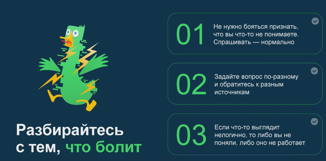 - Нужна хотя бы какая-то уверенность в своём опыте и в себе. Если ты задаёшь вопрос, а ответ на него звучит странно - то варианта два. Либо ты действительно чего-то не понял - и нужно продолжать спрашивать. Либо же что-то реально работает не так, как должно - и вам пытаются впарить какую-то дичь. Такое бывает - не бойтесь челленджить людей, даже если теоретически в этом вопросе они экспертнее вас.