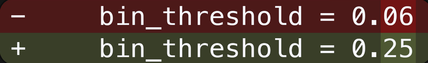 - Проверяем адекватность нейминга в конфигах и вообще корректность его разбиения на подконфиги. bin_threshold - явно плохое название для такой переменной в ML-системе, поскольку может значить много разных вещей.