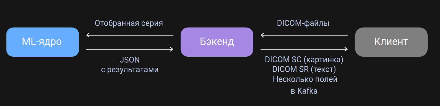 Схема работы нашего сервиса по сравнению с первыми прототипами немного усложнилась, появилась прослойка между клиентом и нейронкой в виде бэкенда, который отвечает за получение и валидацию исследований, отправку запросов на ML, получение результатов в виде JSON, а также генерацию ответов для клиента - обычно в виде SR и SC-серий.
